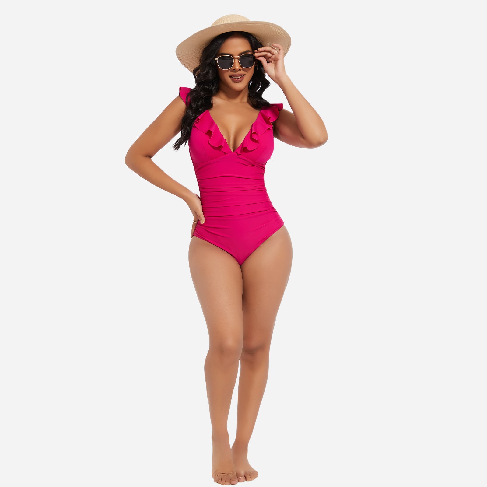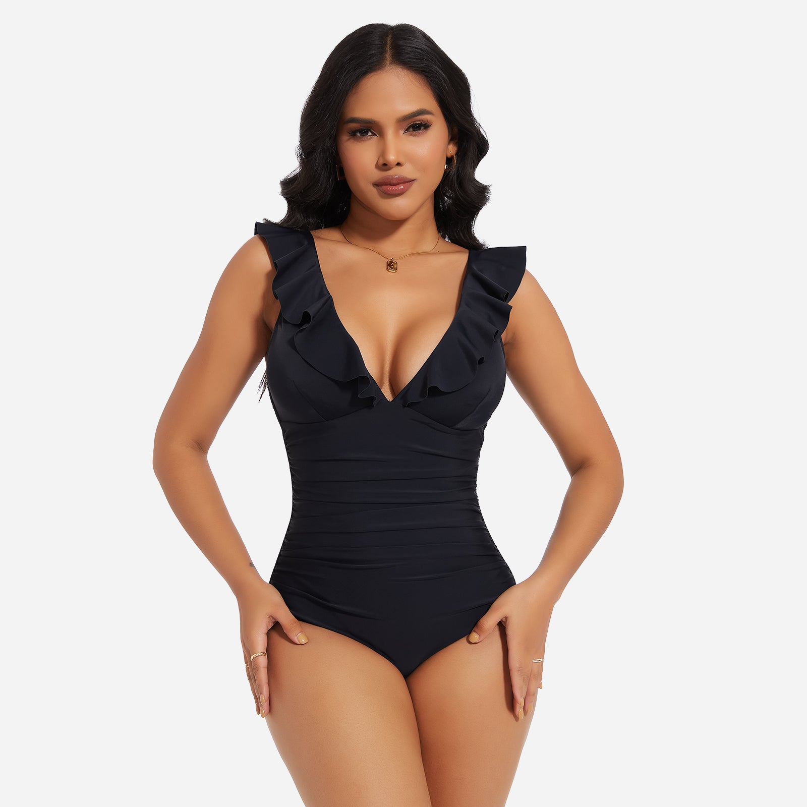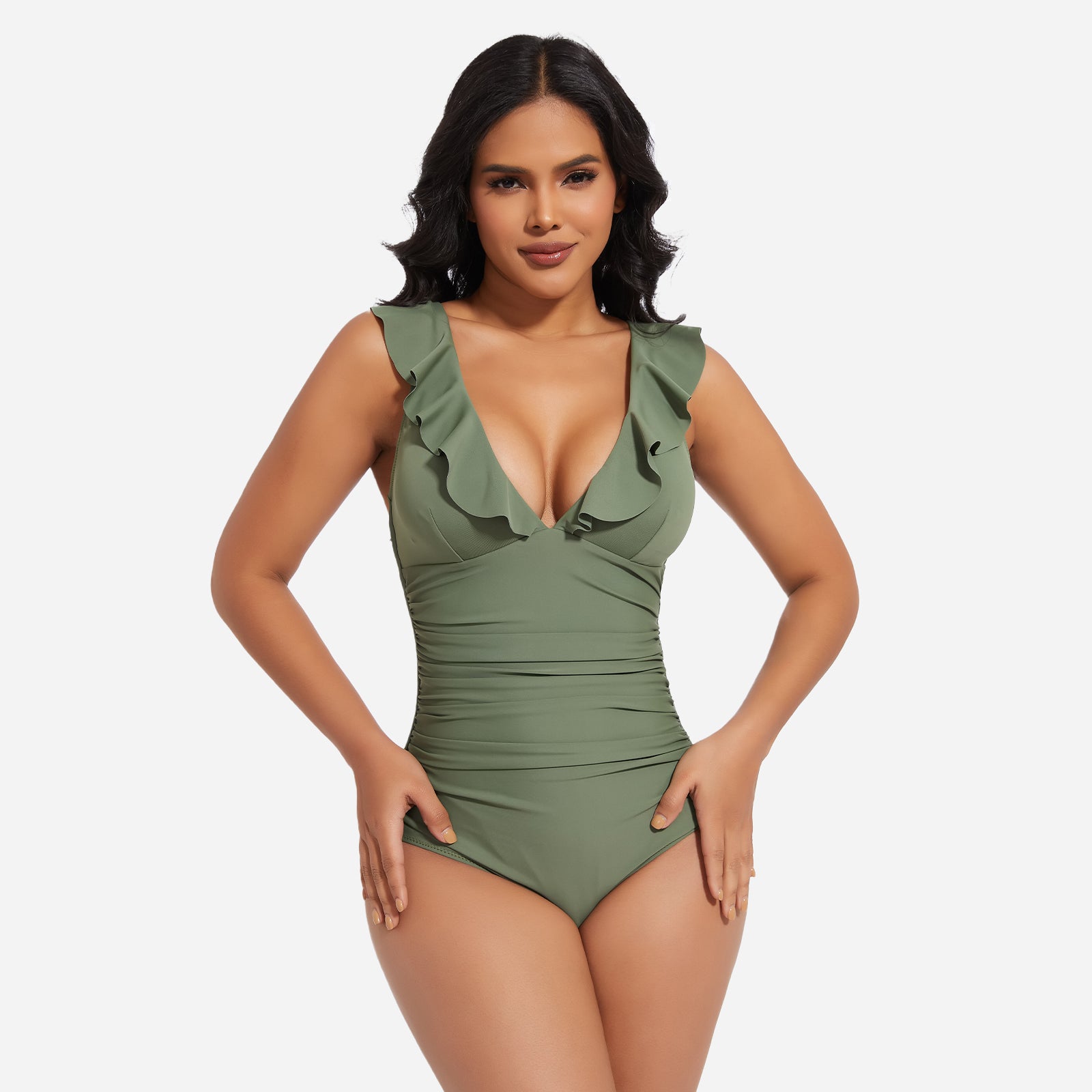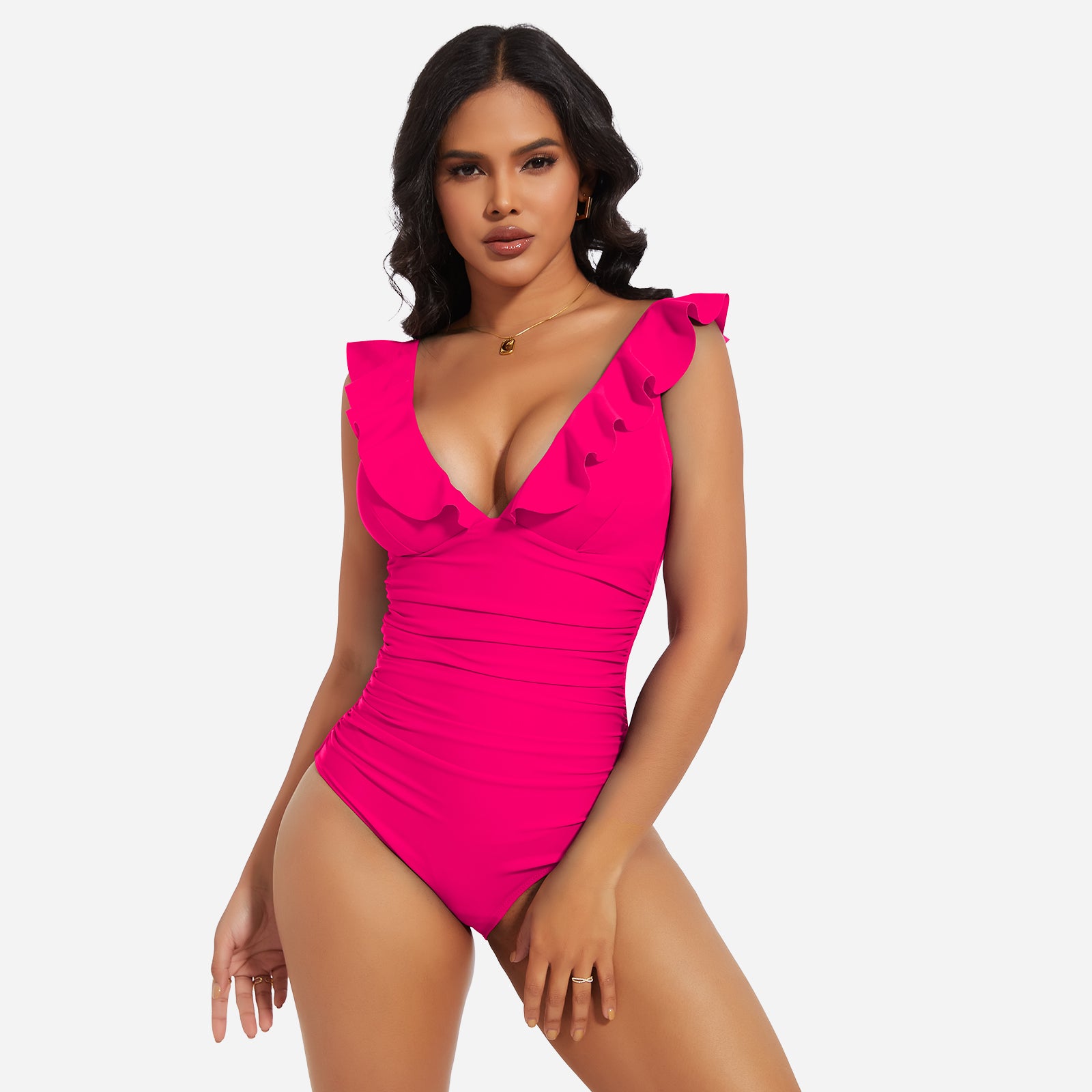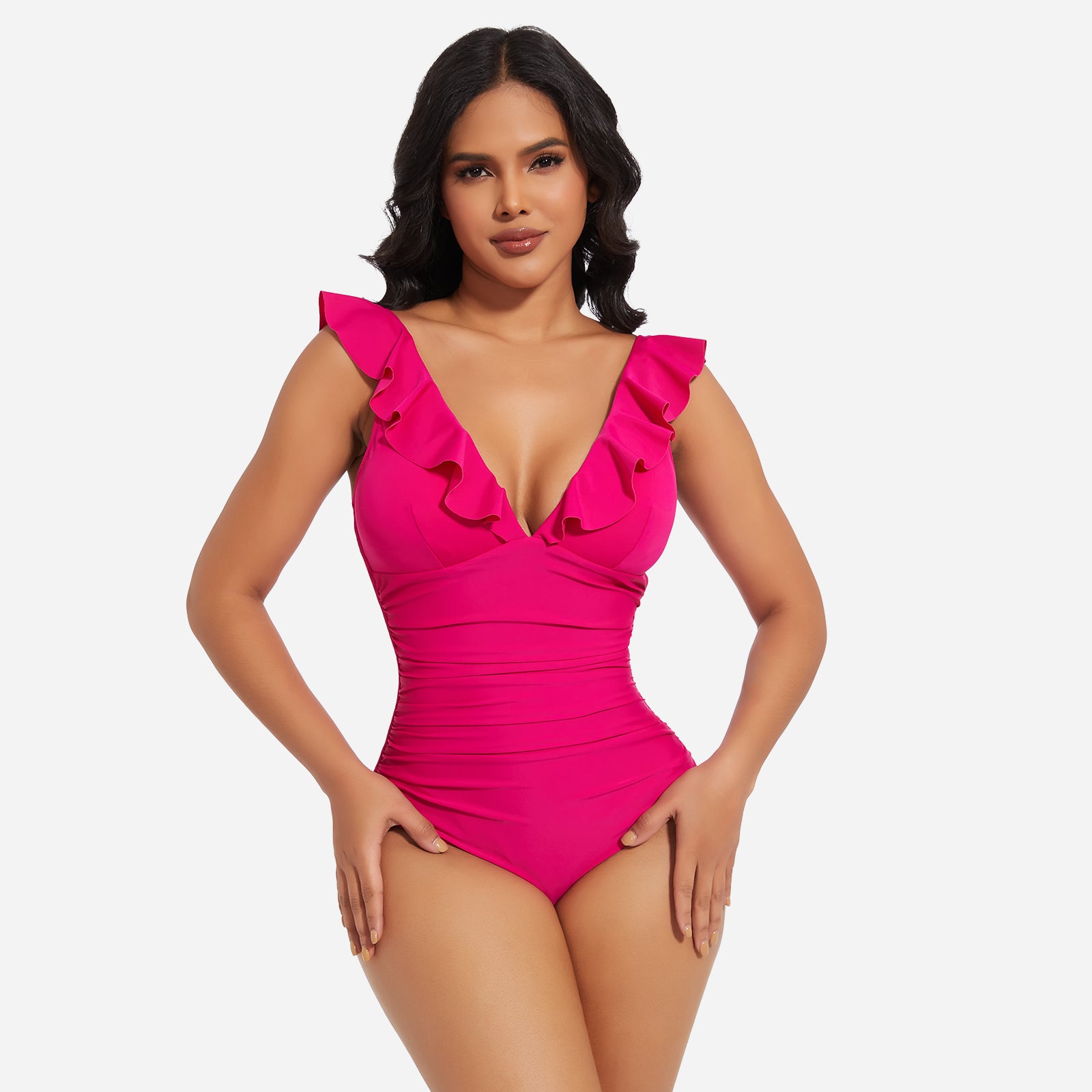 Turn heads at the beach or pool with the JOYSHAPER Women's One Piece Swimsuit, designed with a flattering V-neck and stylish ruffle details. This tummy control bathing suit smooths your midsection and enhances your natural curves, creating a slimming silhouette that boosts your confidence. Made from premium quick-drying and chlorine-resistant fabric, it offers all-day comfort, excellent stretch, and long-lasting durability. The supportive built-in structure and elegant plunge neckline make it ideal for swimming, sunbathing, or resort wear. Whether you're relaxing by the pool or taking a dip in the ocean, this one-piece swimwear combines fashion and function for a chic, body-hugging fit.