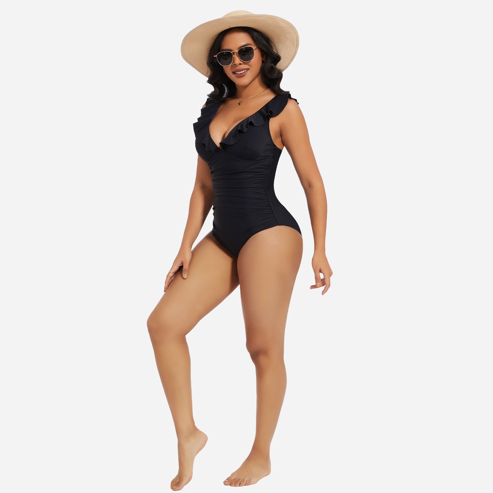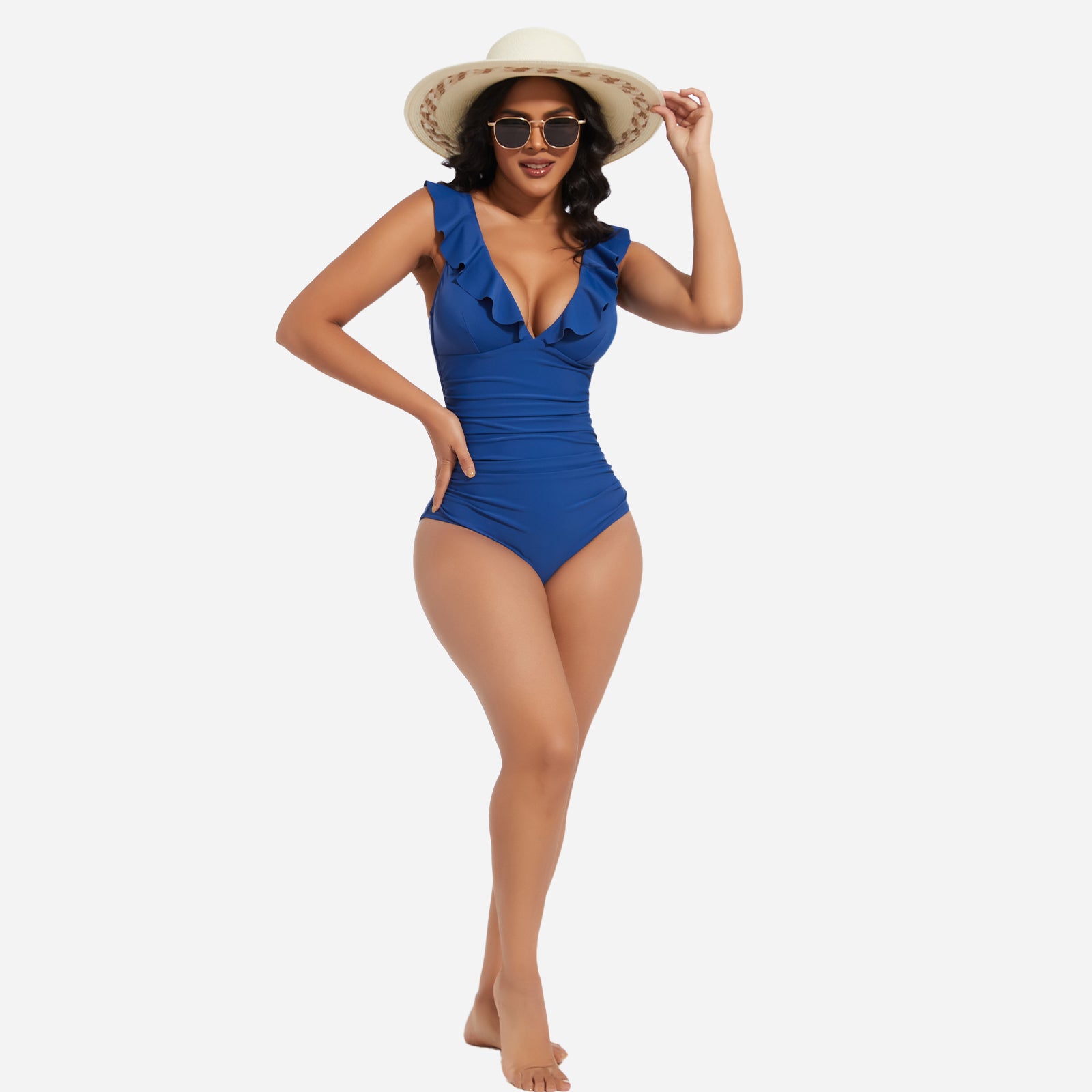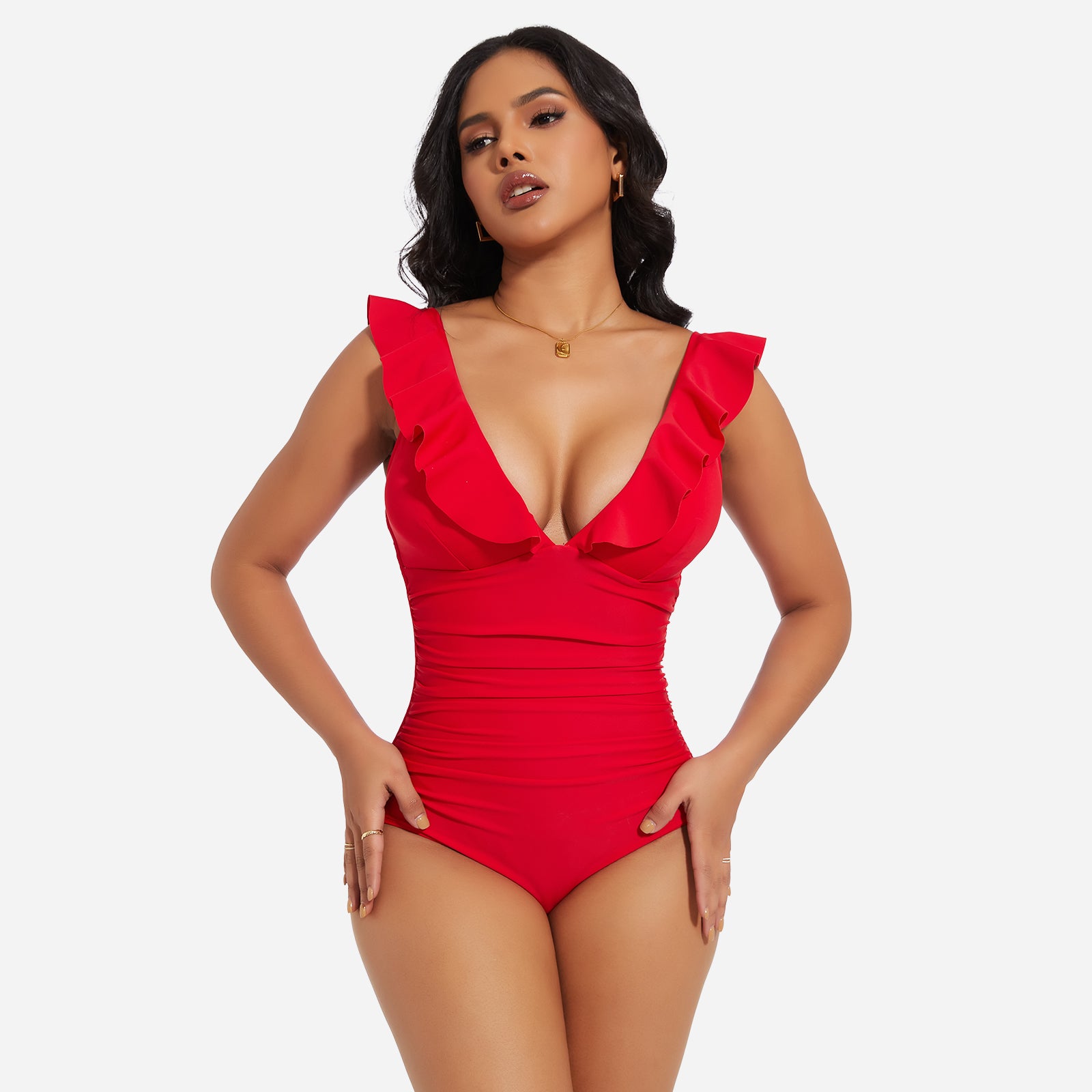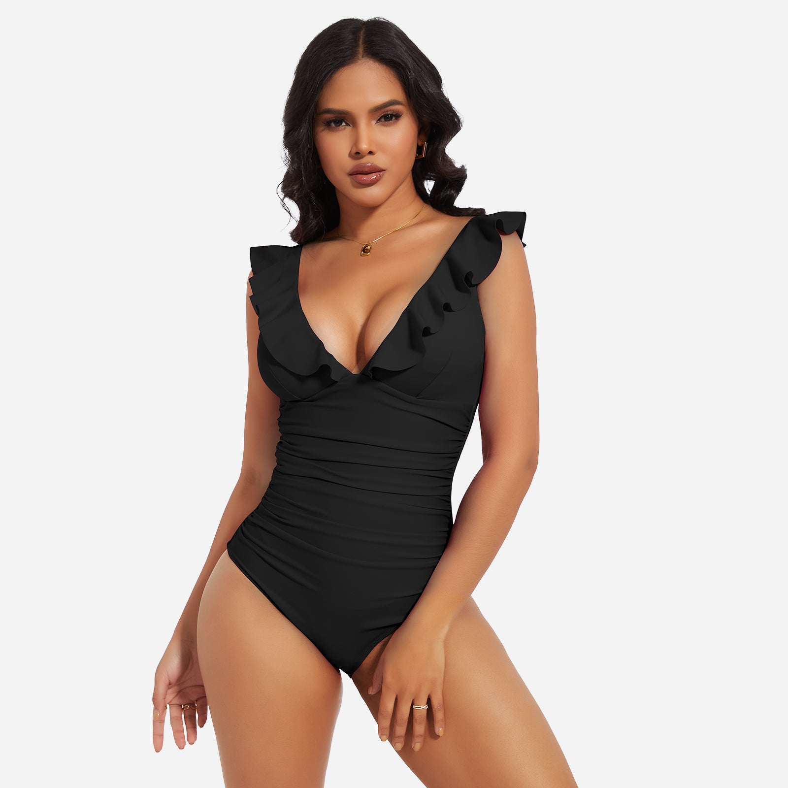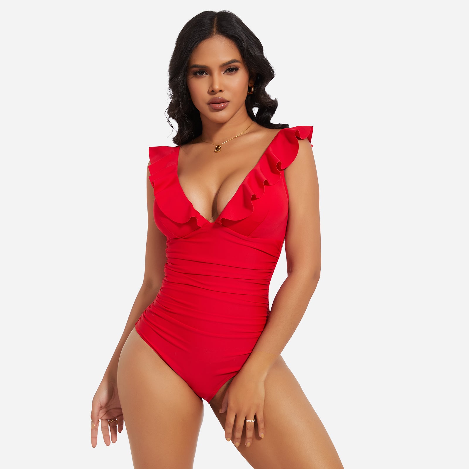 Turn heads at the beach or pool with the JOYSHAPER Women's One Piece Swimsuit, designed with a flattering V-neck and stylish ruffle details. This tummy control bathing suit smooths your midsection and enhances your natural curves, creating a slimming silhouette that boosts your confidence. Made from premium quick-drying and chlorine-resistant fabric, it offers all-day comfort, excellent stretch, and long-lasting durability. The supportive built-in structure and elegant plunge neckline make it ideal for swimming, sunbathing, or resort wear. Whether you're relaxing by the pool or taking a dip in the ocean, this one-piece swimwear combines fashion and function for a chic, body-hugging fit.