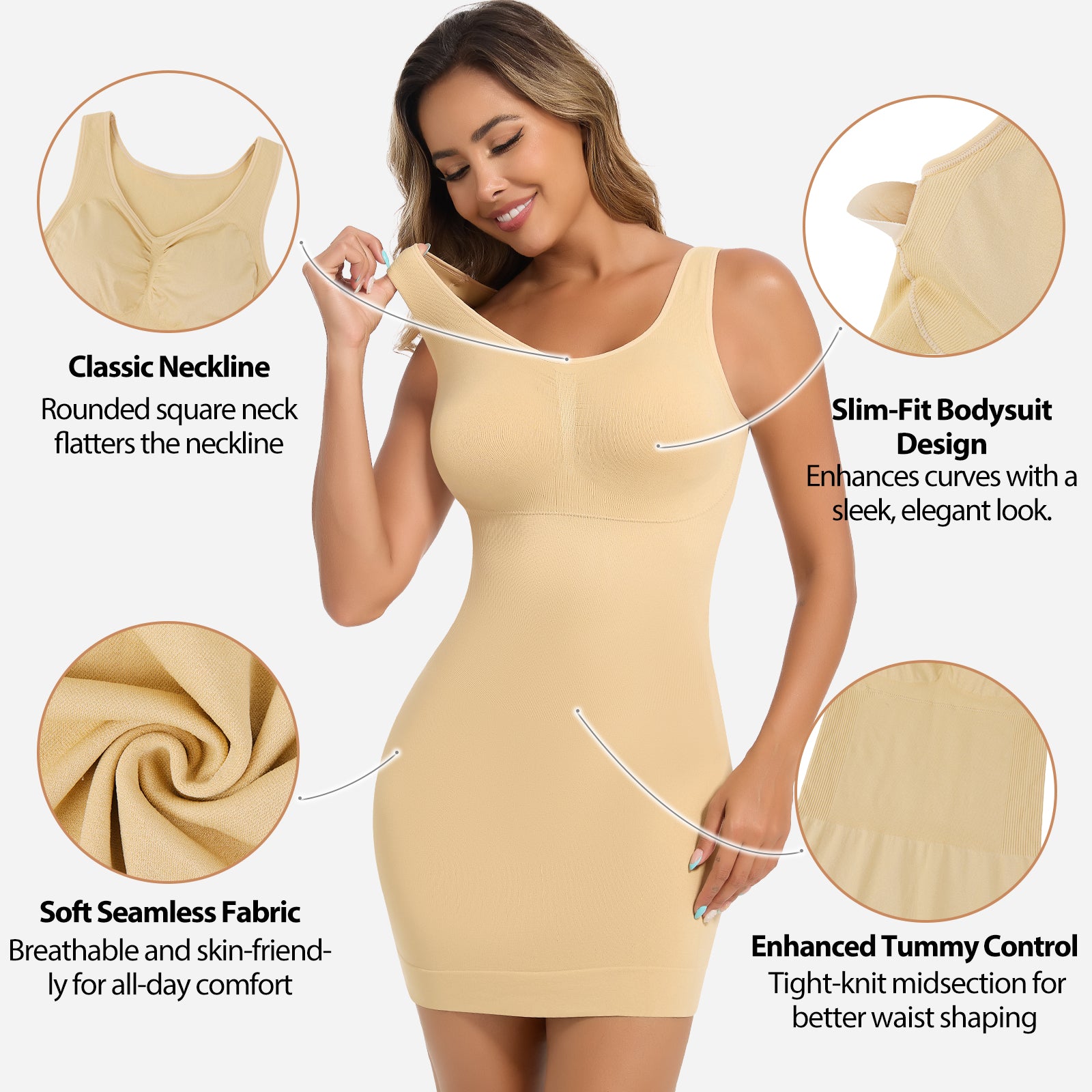Sculpt your figure with the JOYSHAPER Shapewear Dress Slip for Women—a seamless full-body slip designed to smooth, slim, and support. Featuring firm tummy control, a built-in padded bra, this shaping slip dress enhances your natural curves while remaining invisible under clothing. Made from ultra-soft, stretchy, and breathable fabric, it ensures all-day comfort without rolling or digging in. Adjustable spaghetti straps provide a customizable fit for every body type. Perfect for layering under dresses, skirts, or formal wear, this seamless slip is ideal for weddings, work, or everyday confidence. Say goodbye to bulges and hello to a sleeker silhouette with this must-have slimming shapewear dress.