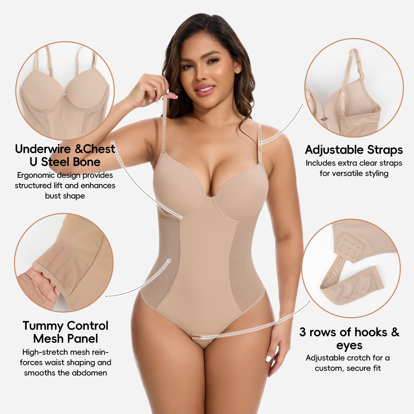Shape and define your curves with the JOYSHAPER Bodysuit with Built-in Bra for Women—a sleek and supportive shapewear essential. Designed with tummy control and a built-in underwire bra, this backless slimming bodysuit smooths your waist, lifts your bust, and stays invisible under any outfit. The thong design ensures no visible panty lines, while the breathable, high-stretch fabric keeps you comfortable all day. Perfect for pairing with low-back dresses, tight-fitting tops, or worn alone as a fashion-forward top, this versatile body shaper delivers seamless support and a sculpted silhouette for every occasion.
