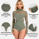 Refine your style with the Joyshaper High Neck Mesh Panel Bodysuit Top. Designed with a classic mock neck and long sleeves, it enhances the neckline with a sleek and sexy touch. Crafted from soft four-way stretch fabric combined with breathable mesh, it offers excellent elasticity, moisture absorption, and all-day comfort. The sheer paneling and ruched detail at the abdomen create a slimming effect, while the slim-fit bodysuit cut and half-covered hip design deliver both elegance and comfort. Finished with a convenient snap closure, this piece is perfect for versatile styling.