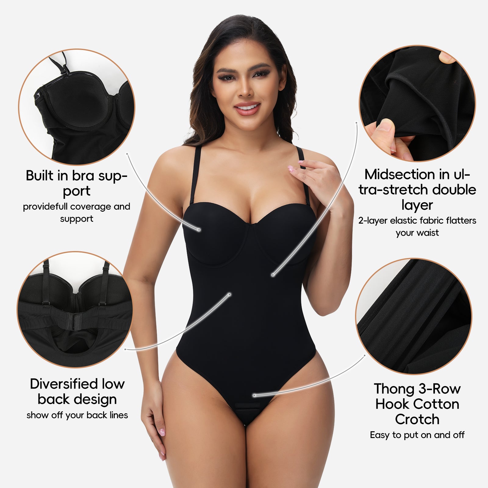 Sculpt your silhouette with the JOYSHAPER Strapless Shapewear Bodysuit for Women—a versatile body shaper designed for all-day confidence. Featuring built-in bra support, firm tummy control, and a low back thong design, this strapless bodysuit smooths and shapes your midsection while lifting your bust and butt. Made from breathable, high-stretch fabric, it stays invisible under dresses and tops, making it ideal for special occasions, weddings, backless outfits, and everyday wear. Whether you're styling it as an undergarment or a top, this body shaping thong bodysuit delivers seamless support and a sleek, flattering fit.